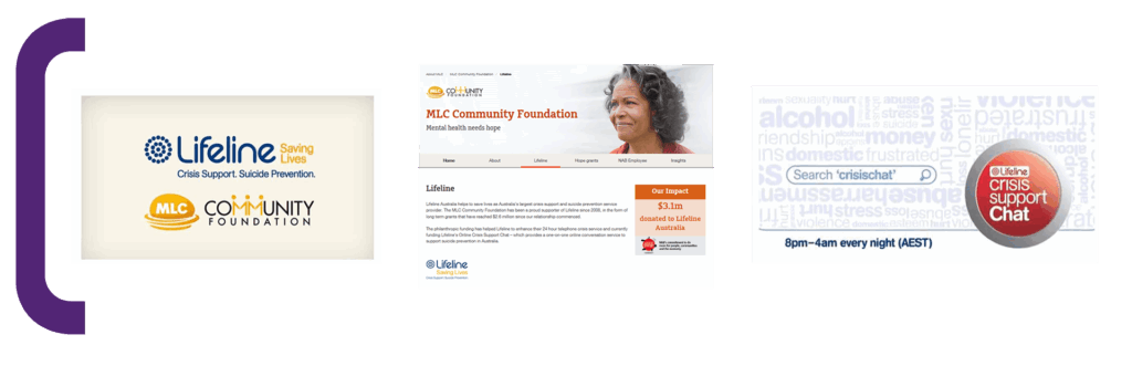 In 2008 MLC Community Foundation engaged us to seek out and secure a flagship cause partner. Utilising our HeartSmart® process, we partnered them with Lifeline Australia. Investing $3.15m over 7 years the partnership expanded and enhanced a new service ‘Lifeline Online Support Chat’. This enabled Australians to seek help online as well as over the phone, which proved to be invaluable for remote and rural Australians and women experiencing domestic violence. The partnership fulfilled the MLC Foundation’s charter to enrich the lives of Australians and support the work of employees. In 2013 the MLC Community Foundation refocused exclusively on mental health. In 2014 MLC Community Foundation won a social impact award from SIMNA (Social Impact Measurement Network Australia). In 2014, Lifeline’s Online Crisis Support Chat saw a 43% reduction in self-harm and suicidality, a 27% increase in belonging and a 21% reduction in call out (ambulance/police) services.