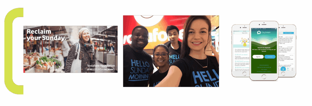In the first few months of the partnership, the app was featured as best new app in the App Store, with over 10,000 downloads and Hello Sunday Morning’s online sign-ups doubled to 50,000. The cause and app deeply resonated with Vodafone’s young team members who embraced the cause by signing up, volunteering at Hello Sunday Morning events, donating and posting regularly on social media.